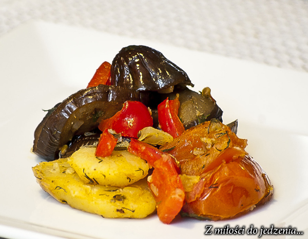 Cebulę kroimy drobne i dusimy do miękkości. Dodajemy ją do bakłażanów i ziemniaków.