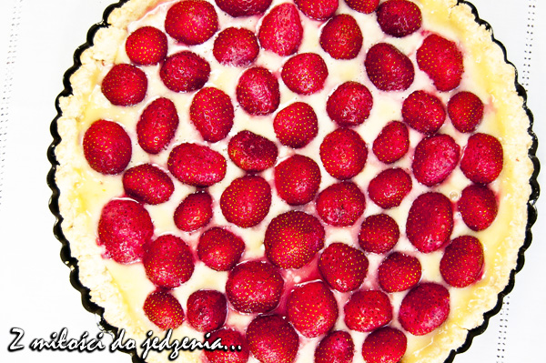 Wyjmujemy ciasto, ostudzamy i smarujemy cienką warstwę ciepłej glazury. Na to wykładamy krem patissiere, a na wierzchu układamy truskawki, które również możemy posmarować glazurą.