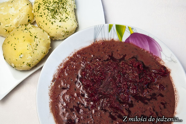 Umyte i obrane ziemniaki i jabłka ścieramy na tarce. Podduszamy na maśle przez kilka minut. Zalewamy wywarem, dodajemy przyprawy (goździki, listek laurowy, sól i cukier) i gotujemy aż buraki będą miękki, co może zając około 2 godzin.
