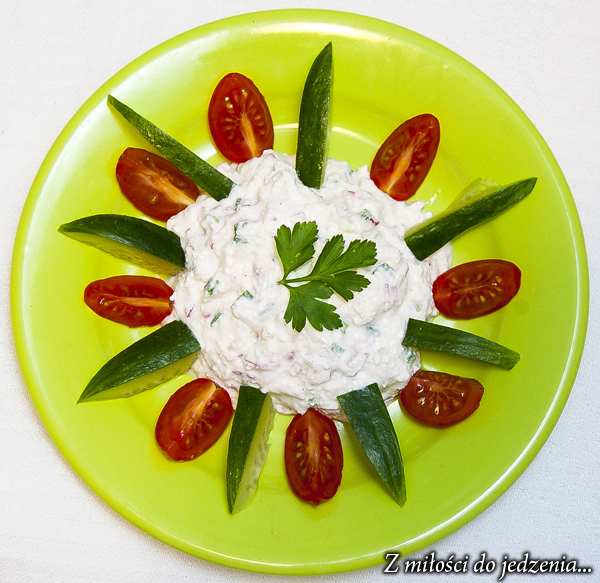 Twarożek można podawać jako pastę kanapkową lub jeść jako dip ze świeżymi warzywami, np. papryką, ogórkiem czy papryką pokrojonymi na kawałki.