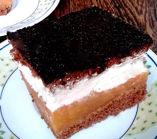 Na pierwszą część przekrojonego biszkoptu (spód) przekładamy masę jabłkową, następnie masę budyniową. Całość przykrywamy drugą częścią biszkoptu i polewamy roztopioną w kąpieli wodnej czekoladą z masłem.