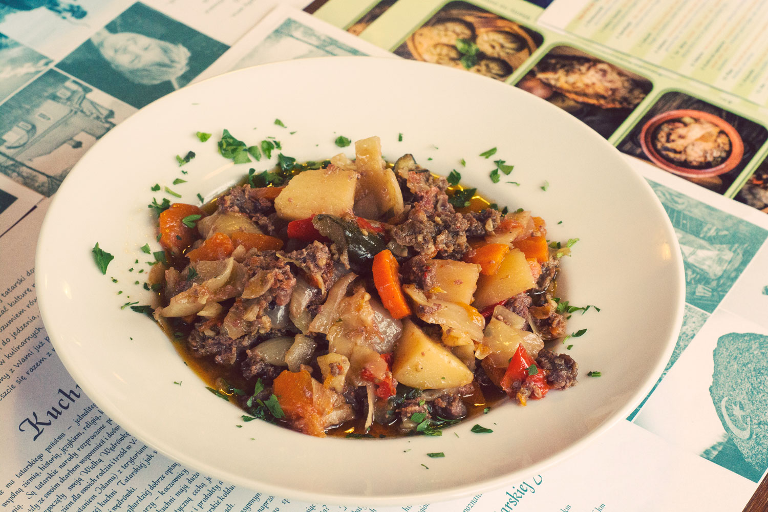 Tradycyjne, gotowane, tatarskie pierogi z farszem jagnięco-wołowym, podawane z rosołem. Mój numer jeden jeśli chodzi o dania główne w Tatarskiej Jurcie. Nieprzyzwoicie smaczne i w tym smaku bardzo głębokie… Kołdunów nie kroimy na talerzu, najlepiej jest zjadać je w całości – w środku mają przepyszny rosół, który po przegryzieniu wypływa na język. Między jednym a drugim kołdunem możemy popijać podany osobno rosół.