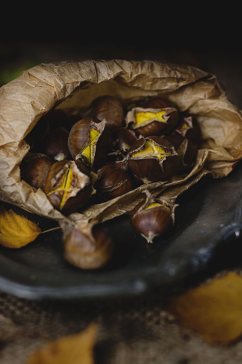 „W Paryżu najlepsze kasztany są na placu Pigalle” – „Zuzanna lubi je tylko jesienią”. A Sylwia (czyli ja – jeśli Drogi Czytający tego nie wiesz, a nie wiedzieć możesz) jadła je dopiero dwa razy w życiu. Raz zimą w Paryżu, choć nie wiem na jakim placu. Drugi raz w swojej białostockiej kuchni. Czy kocham kasztany? Jeszcze nie wiem. Smak mają ciekawy – podobny zupełnie do niczego. Może mi brakować cierpliwości do ich nacinania, ale kasztany jak mało innych rzeczy wydają mi się pasować do jesieni. Kasztany pieczone – czyli w swojej najprostszej postaci, są dobre na początek tej kulinarnej przygody. Ja mam już na swojej liści zupę krem z kasztanów, kasztanowe lody i kurczaka z kasztanami.